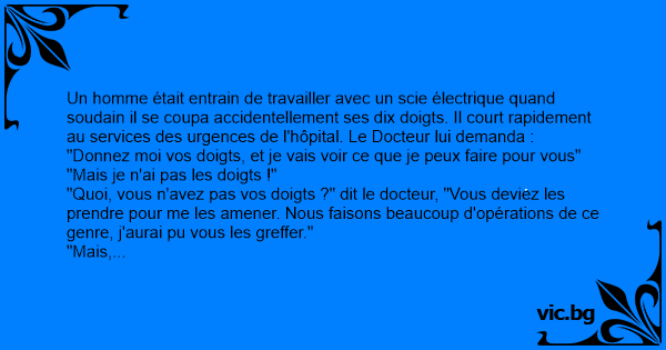 Un homme était entrain de travailler avec un scie électrique quand soudain il se coupa accidentellement ses dix doigts. Il court rapidement au services des urgences de l'hôpital. Le Docteur lui demanda :