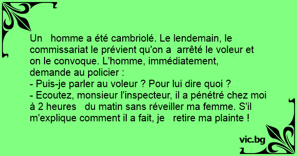 - Ecoutez, monsieur l'inspecteur, il a pénétré chez moi à 2 heures du matin sans réveiller ma femme. S'il m'explique comment il a fait, je retire ma plainte !