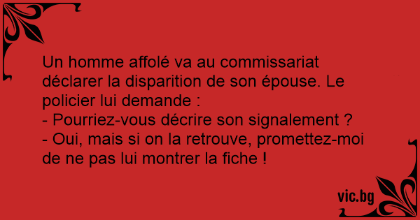 Un homme affolé va au commissariat déclarer la disparition de son épouse. Le policier lui demande :