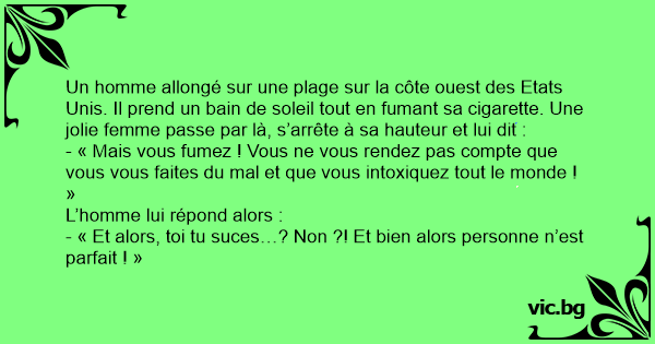 Un homme allongé sur une plage sur la côte ouest des Etats Unis. Il prend un bain de soleil tout en fumant sa cigarette. Une jolie femme passe par là, s’arrête à sa hauteur et lui dit :
