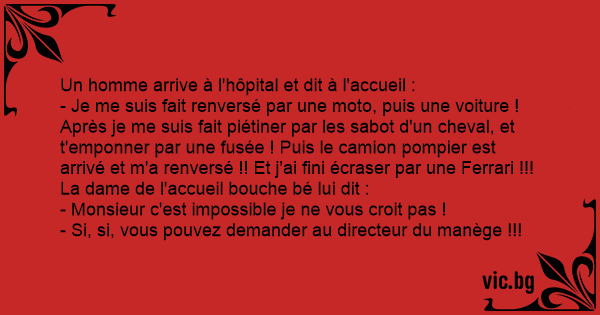 - Je me suis fait renversé par une moto, puis une voiture ! Après je me suis fait piétiner par les sabot d'un cheval, et t'emponner par une fusée ! Puis le camion pompier est arrivé et m'a renversé !! Et j'ai fini écraser par une Ferrari !!!