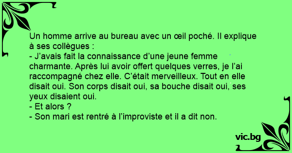 Un homme arrive au bureau avec un œil poché. Il explique à ses collègues :