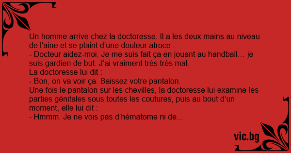 - Docteur aidez-moi. Je me suis fait ça en jouant au handball… je suis gardien de but. J’ai vraiment très très mal.