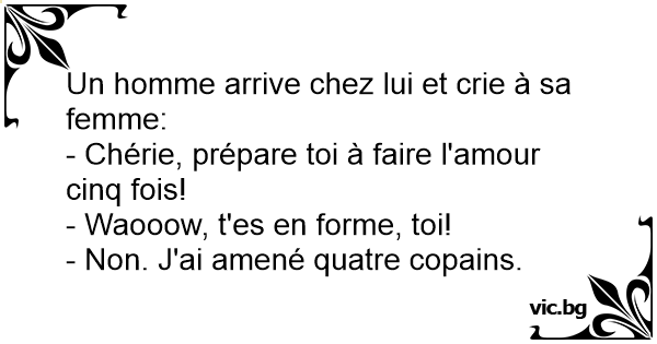 Мъж се прибира у дома му и от вратата крещи на жена си: - Скъпа, приготви се да правиш любов пет пъти! - Леле, в добра форма си! - Не ма, доведох четирима приятели.