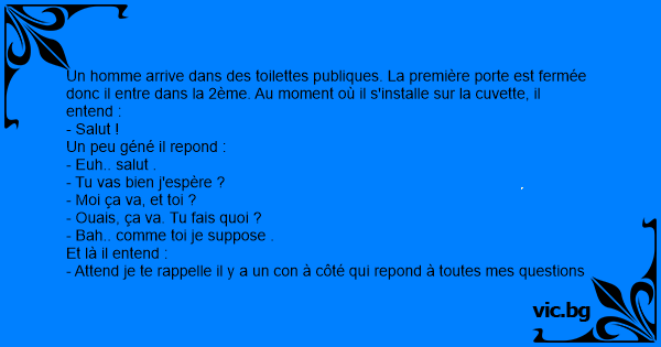 Un homme arrive dans des toilettes publiques. La première porte est fermée donc il entre dans la 2ème. Au moment où il s'installe sur la cuvette, il entend :
