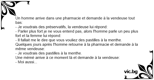 Un homme arrive dans une pharmacie et demande à la vendeuse tout bas: