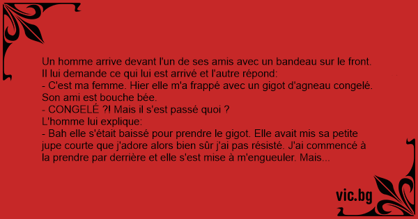 - Bah elle s'était baissé pour prendre le gigot. Elle avait mis sa petite jupe courte que j'adore alors bien sûr j'ai pas résisté. J'ai commencé à la prendre par derrière et elle s'est mise à m'engueuler. Mais d'habitude, quand elle m'insulte, ça m'excite encore plus ! Alors j'y suis allé encore plus fort et là, elle m'a encore plus engueulé, elle a ramassé le gigot et "PAF", elle me l'a mis dans la gueule. Pourtant elle aime d'habitude !