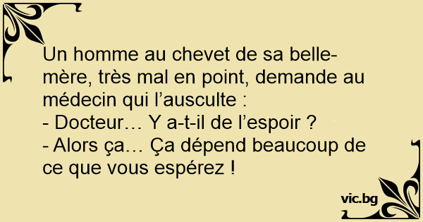 Un homme au chevet de sa belle- mère, très mal en point, demande au médecin qui l’ausculte :