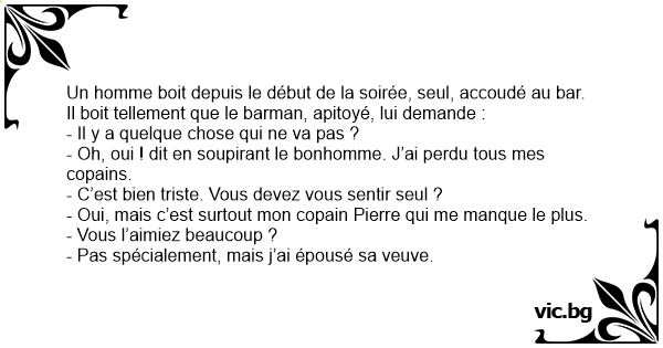 Un homme boit depuis le début de la soirée, seul, accoudé au bar. Il boit tellement que le barman, apitoyé, lui demande :