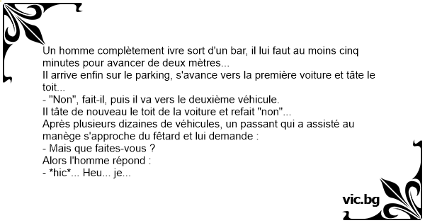 Après plusieurs dizaines de véhicules, un passant qui a assisté au manège s'approche du fêtard et lui demande :