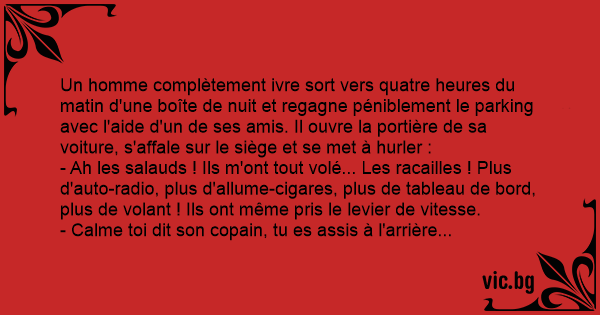 - Ah les salauds ! Ils m'ont tout volé... Les racailles ! Plus d'auto-radio, plus d'allume-cigares, plus de tableau de bord, plus de volant ! Ils ont même pris le levier de vitesse.