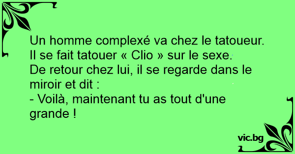 Un homme complexé va chez le tatoueur.<br />Il se fait tatouer « Clio » sur le sexe.<br />De retour chez lui, il se regarde dans le miroir et dit :<br />- Voilà, maintenant tu as tout d'une grande !