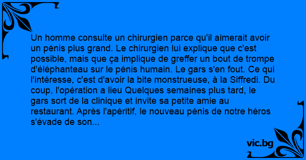 Un homme consulte un chirurgien parce qu'il aimerait avoir un pénis plus grand. Le chirurgien lui explique que c'est possible, mais que ça implique de greffer un bout de trompe d'éléphanteau sur le pénis humain. Le gars s'en fout. Ce qui l'intéresse, c'est d'avoir la bite monstrueuse, à la Siffredi. Du coup, l'opération a lieu Quelques semaines plus таrd, le gars sort de la clinique et invite sa petite amie au restaurant. Après l'apéritif, le nouveau pénis de notre héros s'évade de son pantalon, s'élève au dessus de la table, attrape un bout de pain, et très vite disparaît sous la table. La fille qui a vu la scène n'en revient pas. Elle s'exclame: