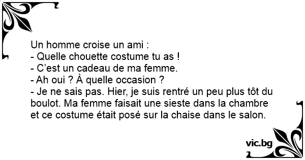 - Je ne sais pas. Hier, je suis rentré un peu plus tôt du boulot. Ma femme faisait une sieste dans la chambre et ce costume était posé sur la chaise dans le salon.