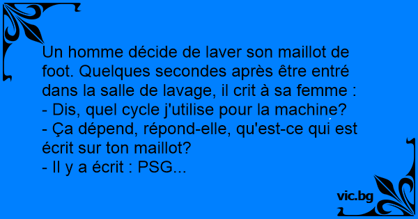Un homme décide de laver son maillot de foot. Quelques secondes après être entré dans la salle de lavage, il crit à sa femme :