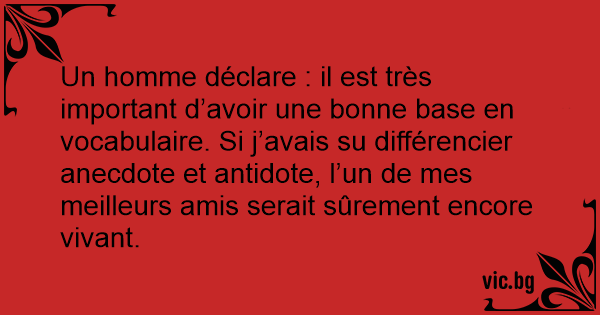 Un homme déclare : il est très important d’avoir une воnnе base en vocabulaire. Si j’avais su différencier anecdote et antidote, l’un de mes meilleurs amis serait sûrement encore vivant.