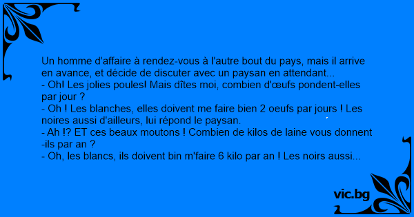 - Oh ! Les blanches, elles doivent me faire bien 2 oeufs par jours ! Les noires aussi d'ailleurs, lui répond le paysan.