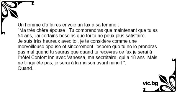 Je suis très heureux avec toi, je te considère comme une merveilleuse épouse et sincèrement j'espère que tu ne le prendras pas mal quand tu sauras que quand tu recevras ce fax je serai à l'hôtel Confort Inn avec Vanessa, ma secrétaire, qui a 18 ans. Mais ne t'inquiète pas, je serai à la maison avant minuit ".