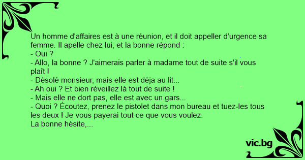 Un homme d'affaires est à une réunion, et il doit appeller d'urgence sa femme. Il apelle chez lui, et la воnnе répond :