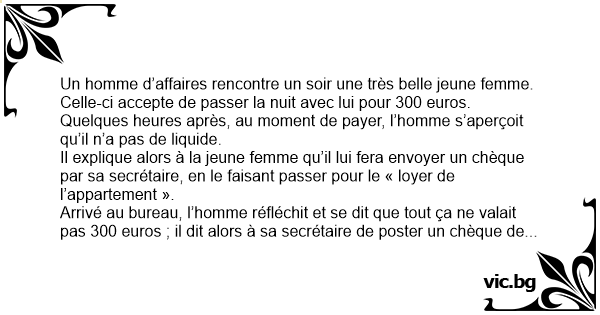 Un homme d’affaires rencontre un soir une très belle jeune femme. Celle-ci accepte de passer la nuit avec lui pour 300 euros. Quelques heures après, au moment de payer, l’homme s’aperçoit qu’il n’a pas de liquide.