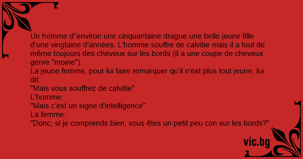 Un homme d''environ une cinquantaine drague une belle jeune fille d'une vingtaine d'années. L'homme souffre de calvitie mais il a tout de même toujours des cheveux sur les bords (il a une coupe de cheveux genre "moine").