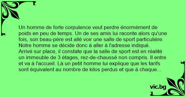 Arrivé sur place, il constate que la salle de sport est en réalité un immeuble de 3 étages, rez-de-chaussé non compris. Il entre et va à l'accueil. Là un petit homme lui explique que les tarifs sont équivalent au nombre de kilos perdus et que à chaque fois qu l'on monte un étage les tarifs augmentent. Notre monte donc au premier étage et rencontre un autre petit homme qui lui réclame la modeste somme de 10€. Notre homme paye et va dans une salle que le petit homme lui a indiqué.