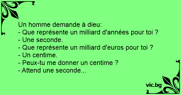 Moïse demande à Dieu: "pour vous que représente 10 millions d'années ?" pour moi c'est une seconde Moïse un peu excité reprend: "et 10 millions de dollars ?" "Et bien, un dollar " le type de plus...