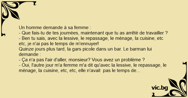 - Oui, l'autre jour m'a femme m'a dit qu'avec la lessive, le repassage, le ménage, la cuisine, etc, etc, elle n'avait pas le temps de s'ennuyer.