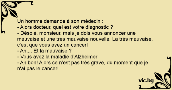 Un patient et son médecin discutent: Le docteur: - J'ai une mauvaise nouvelle et une très mauvaise nouvelle pour vous... Le patient: - Quelle est la mauvaise? Le docteur: - Vous avez le cancer Le...