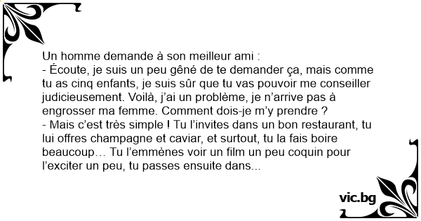 - Écoute, je suis un peu gêné de te demander ça, mais comme tu as cinq enfants, je suis sûr que tu vas pouvoir me conseiller judicieusement. Voilà, j’ai un problème, je n’arrive pas à engrosser ma femme. Comment dois-je m’y prendre ?