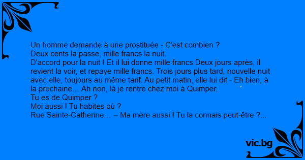 D'accord pour la nuit ! Et il lui donne mille francs Deux jours après, il revient la voir, et repaye mille francs. Trois jours plus таrd, nouvelle nuit avec elle, toujours au même tarif. Au petit matin, elle lui dit - Eh bien, à la prochaine… Ah non, là je rentre chez moi à Quimper.