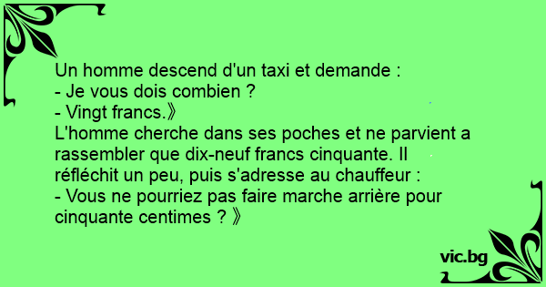 L'homme cherche dans ses poches et ne parvient a rassembler que dix-neuf francs cinquante. Il réfléchit un peu, puis s'adresse au chauffeur :