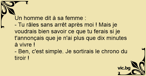 - Tu râles sans arrêt après moi ! Mais je voudrais bien savoir ce que tu ferais si je t'annonçais que je n'ai plus que dix minutes à vivre !