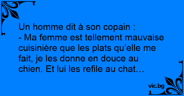 - Ma femme est tellement mauvaise cuisinière que les plats qu’elle me fait, je les donne en douce au chien. Et lui les refile au chat…