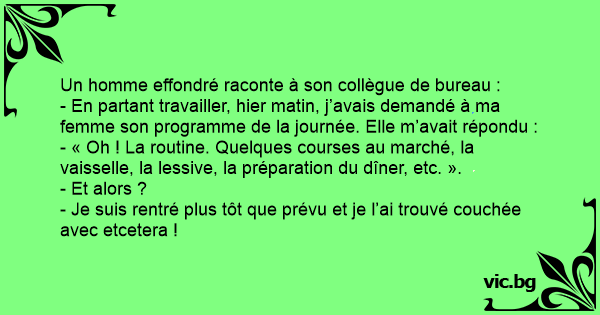 - En partant travailler, hier matin, j’avais demandé à ma femme son programme de la journée. Elle m’avait répondu :