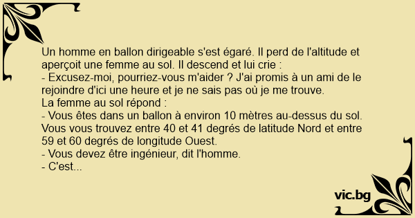 Un homme en ballon dirigeable s'est égaré. Il perd de l'altitude et aperçoit une femme au sol. Il descend et lui crie :
