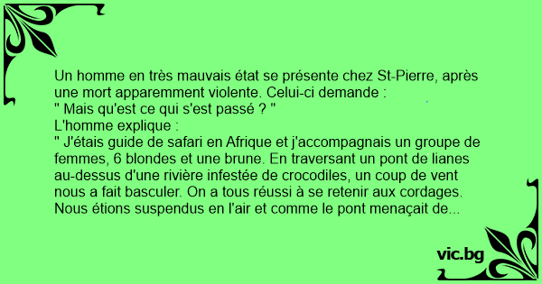" J'étais guide de safari en Afrique et j'accompagnais un groupe de femmes, 6 blondes et une brune. En traversant un pont de lianes au-dessus d'une rivière infestée de crocodiles, un coup de vent nous a fait basculer. On a tous réussi à se retenir aux cordages. Nous étions suspendus en l'air et comme le pont menaçait de lâcher à cause du poids, il fallait que quelqu'un se sacrifie. Comme j'étais le seul homme... "