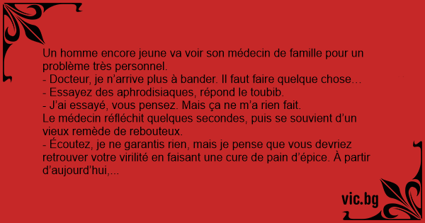 - Écoutez, je ne garantis rien, mais je pense que vous devriez retrouver votre virilité en faisant une cure de pain d’épice. À partir d’aujourd’hui, ne mangez plus que ça.