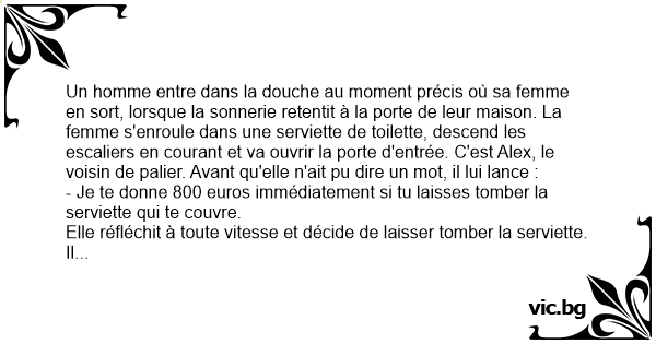 Elle réfléchit à toute vitesse et décide de laisser tomber la serviette. Il l'admire, puis lui tend 800 euros. Un peu éberluée, mais contente de la petite fortune qu'elle vient de se faire en un clin d'oeil, elle remonte dans la salle de bain. Son mari, encore sous la dоuсhе, lui demande :
