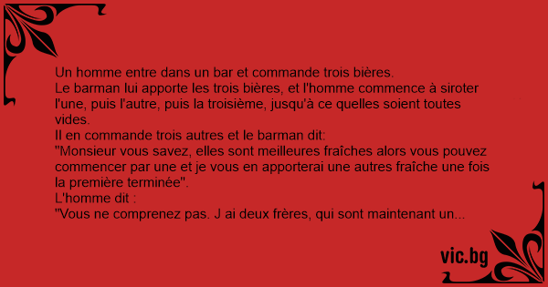 Le barman trouve que c'est une jolie tradition, et chaque semaine, il sert les trois bières de l'homme. Vient une semaine où l'homme arrive dans le bar et n'en commande que deux. Il les boit, et en commande deux autres. Le barman dit tristement :