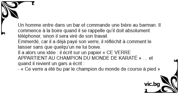 Il a alors une idée : il écrit sur un papier « CE VERRE APPARTIENT AU CHAMPION DU MONDE DE KARATÉ » … et quand il revient un gars a écrit :