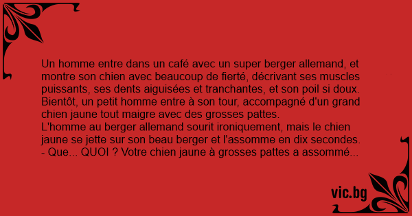 Un homme entre dans un café avec un super berger allemand, et montre son chien avec beaucoup de fierté, décrivant ses muscles puissants, ses dents aiguisées et tranchantes, et son poil si doux. Bientôt, un petit homme entre à son tour, accompagné d'un grand chien jaune tout maigre avec des grosses pattes.