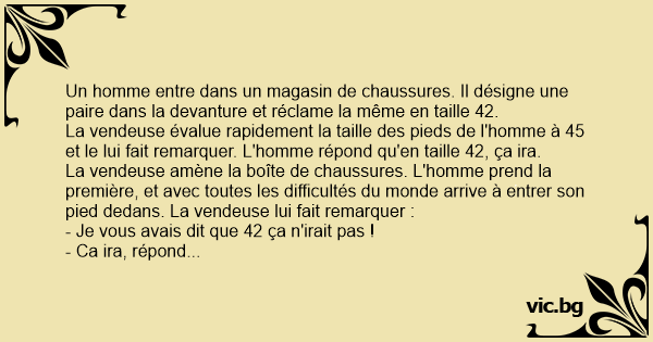 La vendeuse amène la boîte de chaussures. L'homme prend la première, et avec toutes les difficultés du monde arrive à entrer son pied dedans. La vendeuse lui fait remarquer :