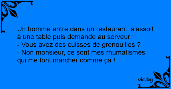 - Γκαρσόν, έχεις βατραχοπόδαρα; - Όχι κύριε, οι ρευματισμοί μου με κάνουν να περπατάω έτσι.