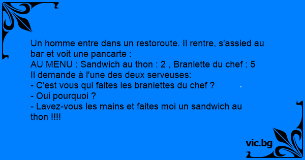 Un homme va dans un bar et voit une pancarte inscrit dessus: "Bière : 3€ Sandwich : 7€ Masturbation : 30€" Alors l'homme s'installe à une table et accoste la jolie serveuse: - Salut, c'est toi qui...