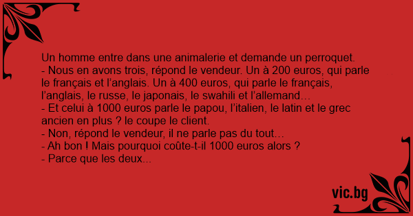 - Nous en avons trois, répond le vendeur. Un à 200 euros, qui parle le français et l’anglais. Un à 400 euros, qui parle le français, l’anglais, le russe, le japonais, le swahili et l’allemand…