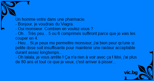 C'est un vieil homme de 80 ans qui rentre dans une pharmacie. -"Bonjour, je voudrai du viagra" Le pharmacien lui demande, - "Combien en voulez vous?" - "Ho, seulement la moité d'un!" - "Vu votre grand âge, il vous faudra plus d'un pour faire plaisir à votre dame!" - "Mais vous vous trompais jeune...
