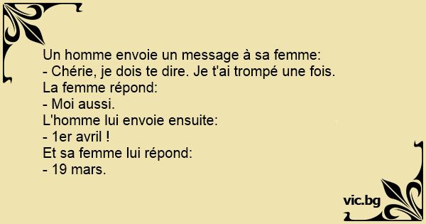 Une nana, un mec : - Chéri, je dois t’avouer une chose… Je t’ai trompé une fois. - Moi aussi… - 1er avril !!!!!!! - 18 août.
