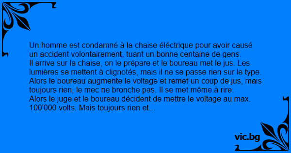 Alors le juge et le boureau décident de mettre le voltage au max. 100'000 volts. Mais toujours rien et le mec rigole de plus belle.