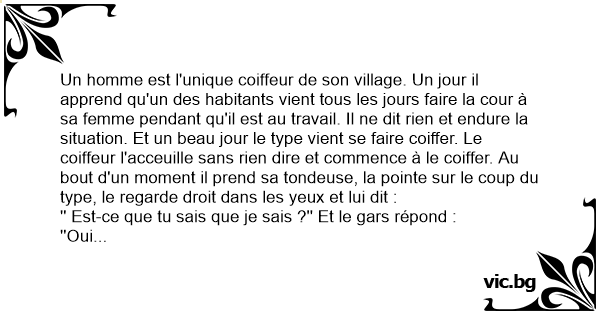 Un homme est l'unique coiffeur de son village. Un jour il apprend qu'un des habitants vient tous les jours faire la cour à sa femme pendant qu'il est au travail. Il ne dit rien et endure la situation. Et un beau jour le type vient se faire coiffer. Le coiffeur l'acceuille sans rien dire et commence à le coiffer. Au bout d'un moment il prend sa tondeuse, la pointe sur le coup du type, le regarde droit dans les yeux et lui dit :